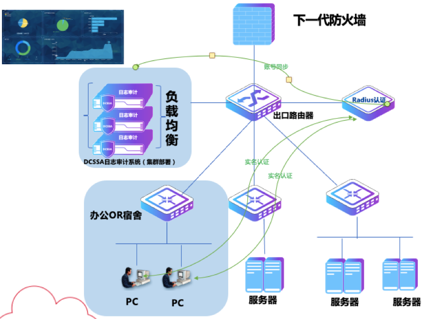 NAT实名审计:校园出口设备做了NAT转换,出现问题要溯源时无法找到真实的责任人,需要对大出口NAT等做转换日志找到真实地址,并和实名认证设备联动认证。