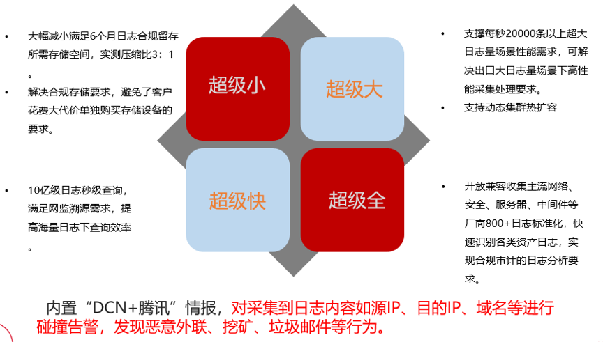 安全运维运营效率:海量日志信息中运维运营压力大,需要智能分析能力、情报分析能力发现海量日志潜在威胁,发挥日志分析的威胁预警能力。